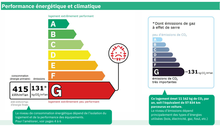 Classe climat : le niveau d’émission de CO₂, également noté de A à G.